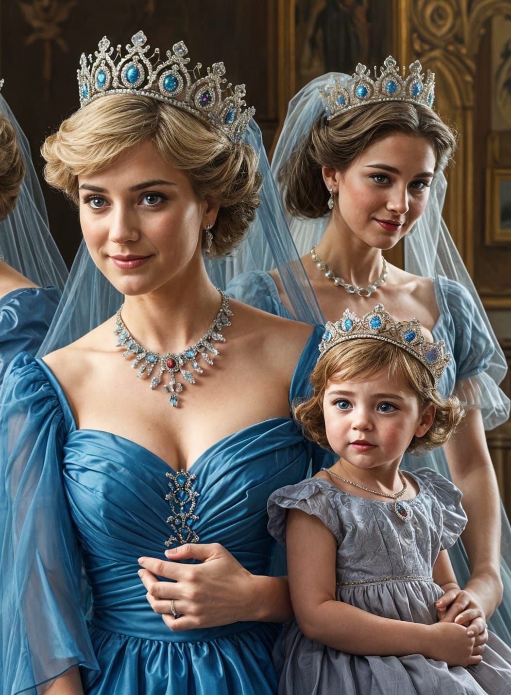 This image features a stunning double exposure of Princess Diana, Kate, and Charlotte in their finest royal attire, evoking an ethereal and regal atmosphere.