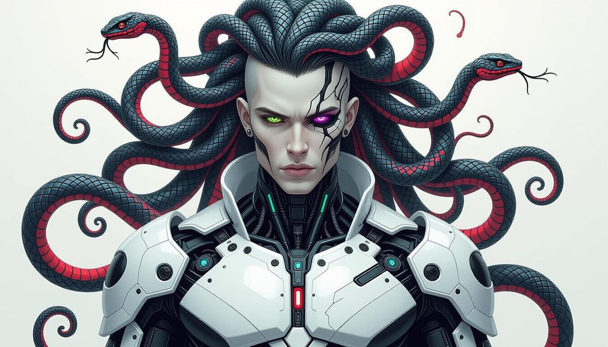 A striking picture of a biomechanical cyborg Medusa with white and black body armor. Dragon tattoos coil across the cyborg's body, glowing softly with deep purples, grays, and metallic gold accents in a dark biomechanical style.