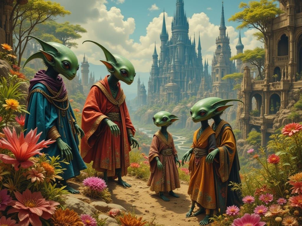 This image shows friendly aliens in ornate robes, smiling and conversing in a colorful, dreamlike setting. The scene includes detailed architecture and flourishing plants, rendered as a matte painting with rich, complementary colors akin to fantasy art.