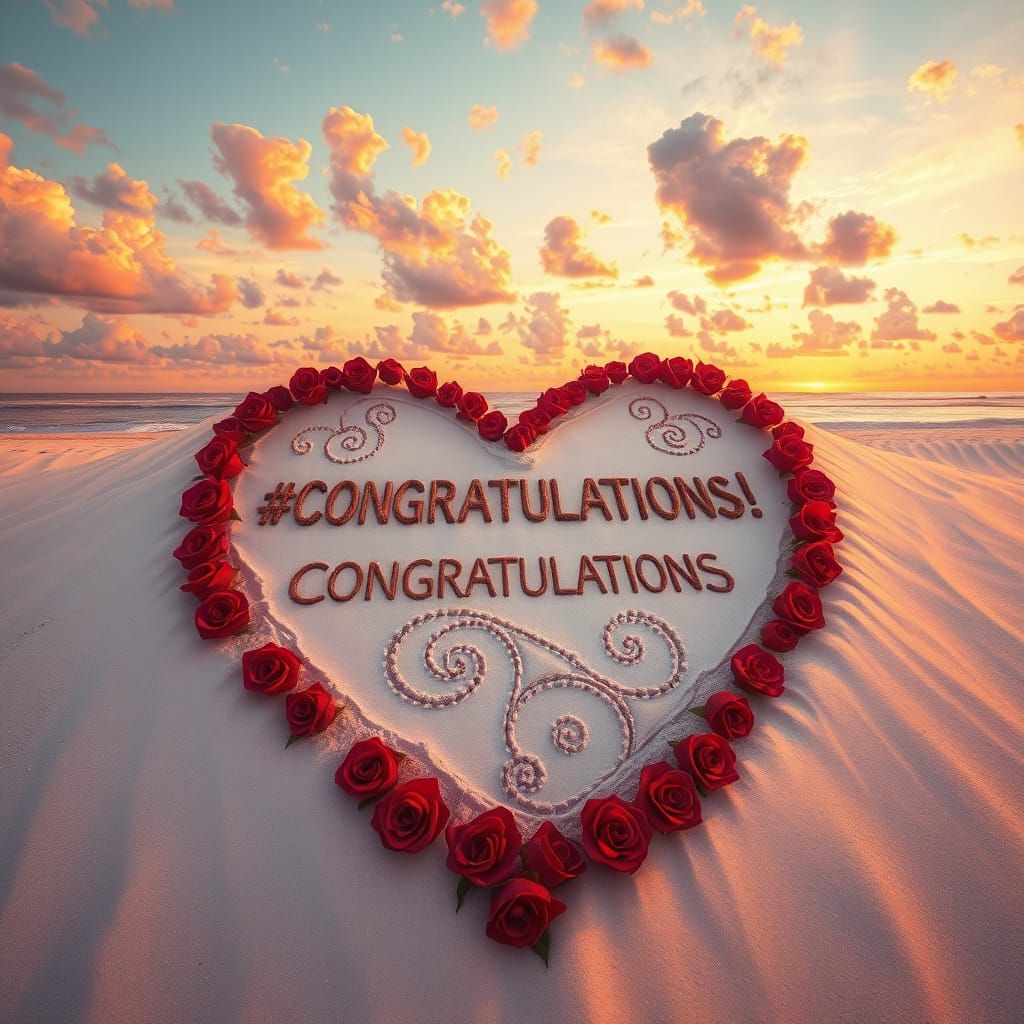 This image shows a breathtaking beach scene at sunset, with vibrant, iridescent clouds and a heart-shaped arrangement of roses on the pristine white sand. The scene is infused with a sense of serenity and joy, blending photorealistic digital art with a dreamy, romantic atmosphere.
