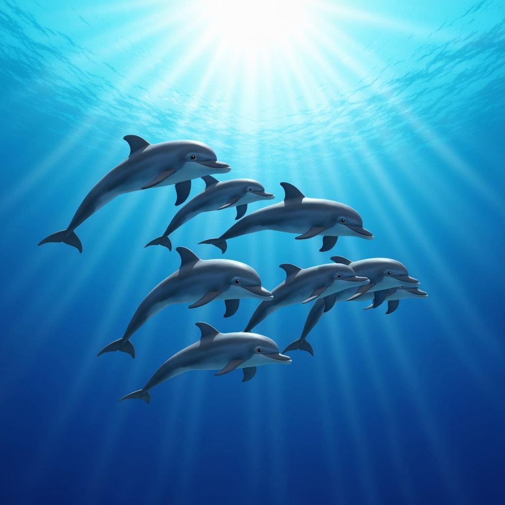 This image shows a vibrant blue ocean filled with a school of dolphins. The artwork is reminiscent of 3D digital art, with bright lighting and intricate details, similar to a Pixar or Disney movie.