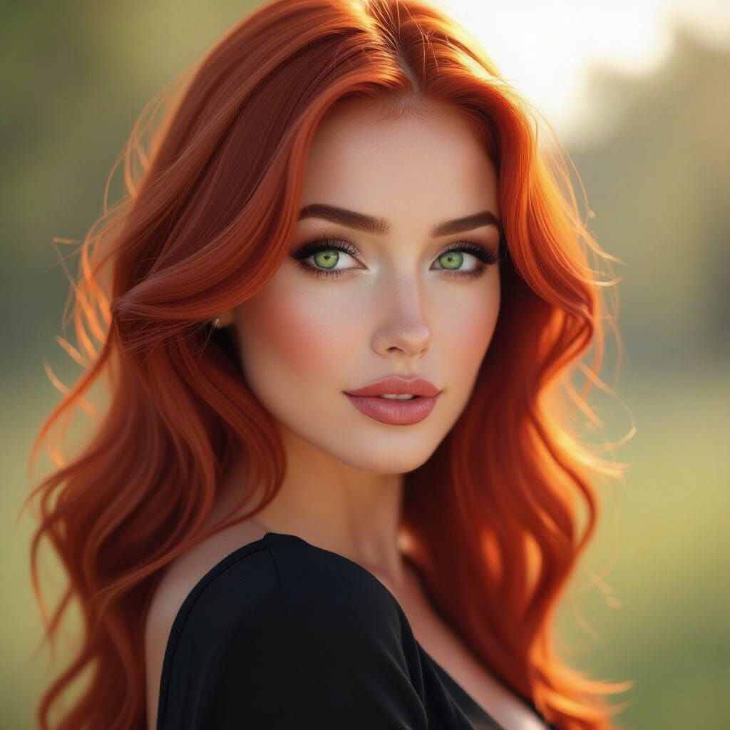 Generate unique images of beautiful women with striking features like red hair and green eyes. Free and easy to use!