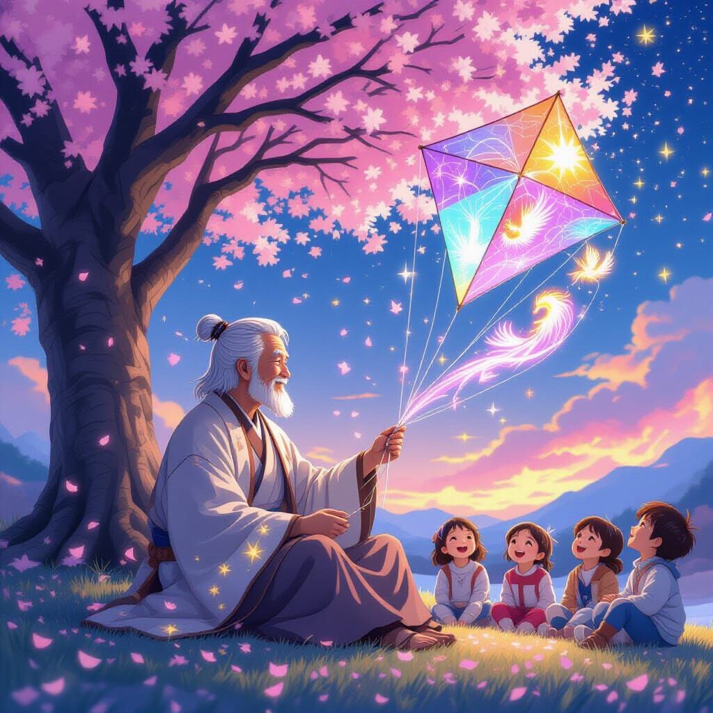 This image shows a kindly old man with silver hair sitting under a cherry blossom tree at twilight. He holds a kite with trails of light, surrounded by laughing children in an anime style.