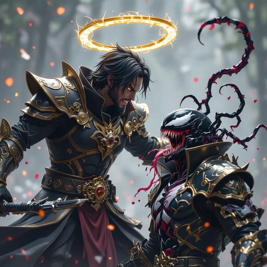 A detailed 3D anime art piece showing a warrior with a golden halo fighting a venomous foe. The scene features intense action and a dark, consuming aesthetic.