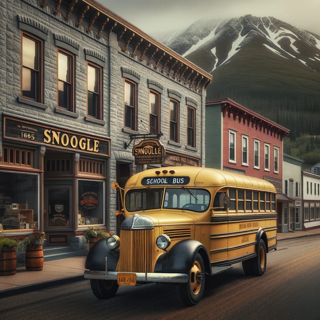 This vintage photograph captures a historic small town street scene featuring a yellow 1930s school bus with Art Deco details. A stone building with 'Snoogle' signage and a red commercial building are also visible, set against a backdrop of snow-capped mountains.