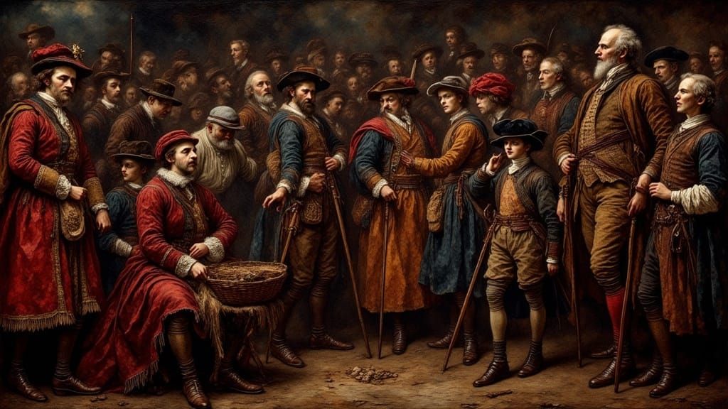 This image shows a detailed painting of a 17th-century Dutch militia scene. The artwork features deep earthy tones, strong highlights, and diffused lighting reminiscent of old master paintings.