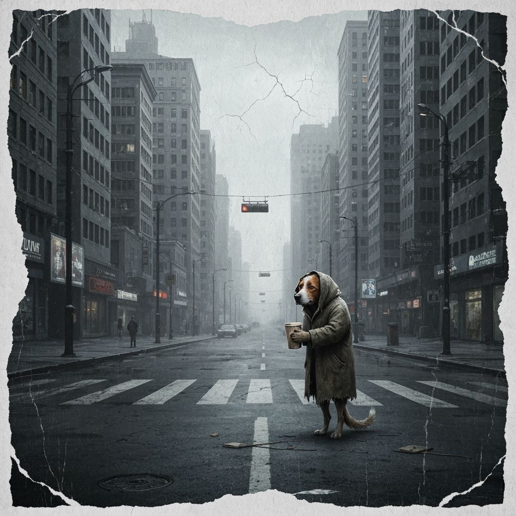 This image shows a forlorn dog begging in a bleak, dystopian city. The artwork features oil painting textures, cracked paint, and grungy details, creating a moody, HDR-lit scene with a sense of urban decay.