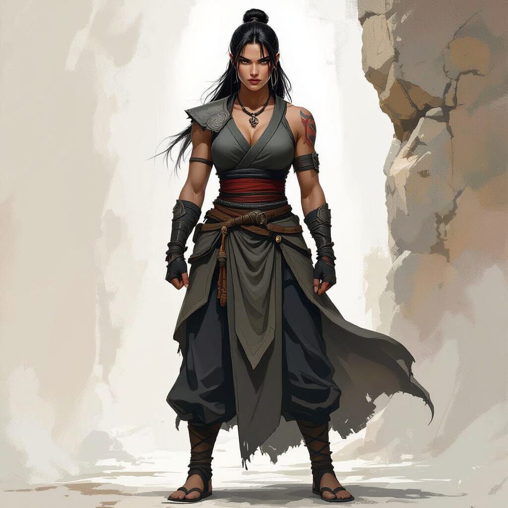 A striking image of a tall, muscular young Goliath monk with gray skin and a scar on her cheek. Rendered in a dramatic, high-contrast fantasy art style with dynamic lighting.