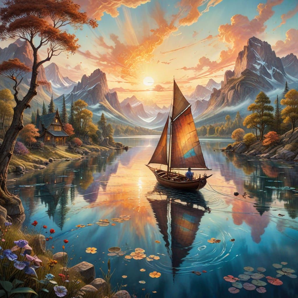 This enchanting watercolor and ink painting captures a serene sailing boat on a tranquil lake at sunset. Soft, golden light and delicate brushstrokes evoke a sense of wanderlust and wonder, blending dreamlike modernity with ethereal narrative.