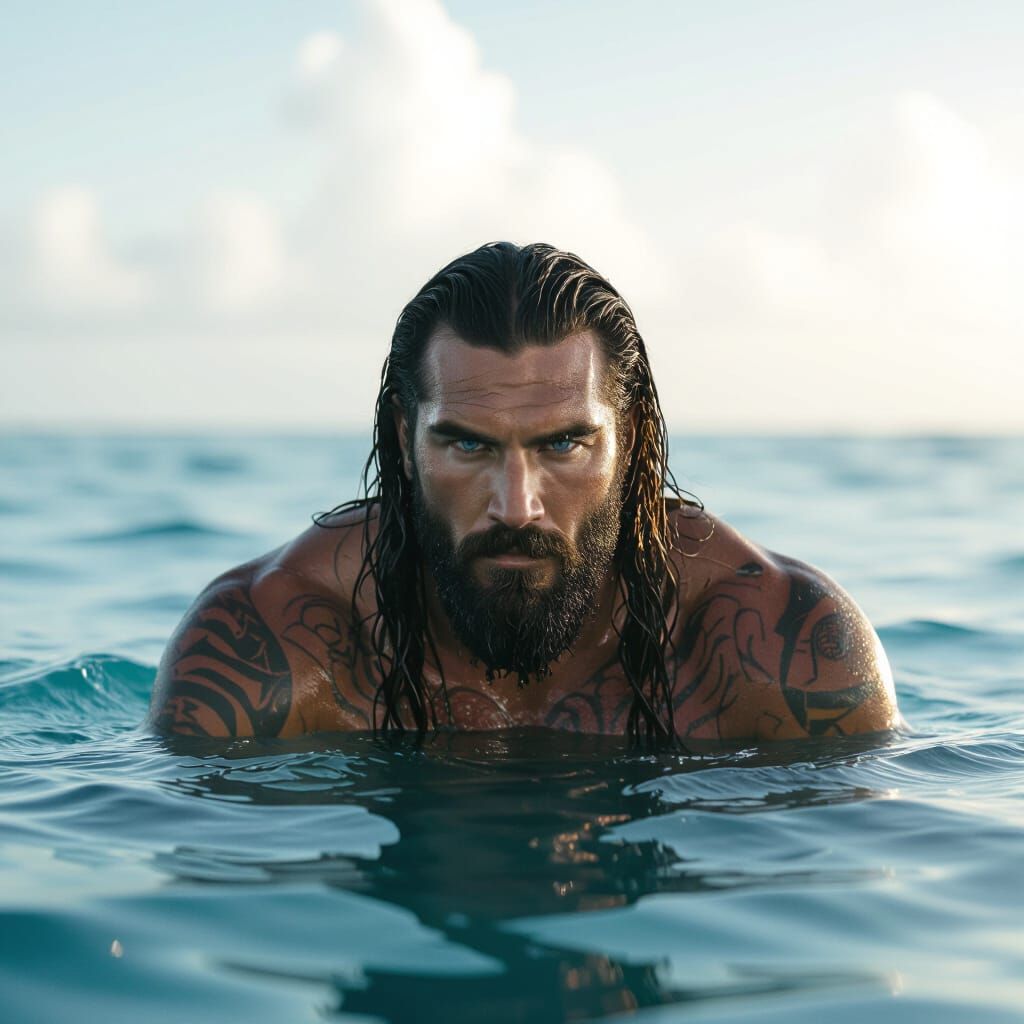 This cinematic image captures a wise, ancient male with long dark hair and piercing blue eyes. He possesses a strong, handsome presence, adorned with meaningful tattoos, presented with dramatic atmospheric lighting.