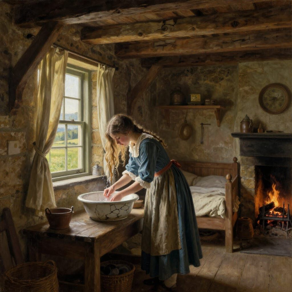 This image shows a farm girl washing her hair in a quaint country cottage bedroom during Regency England. Rendered as an oil painting with dramatic lighting and visible brushstrokes.
