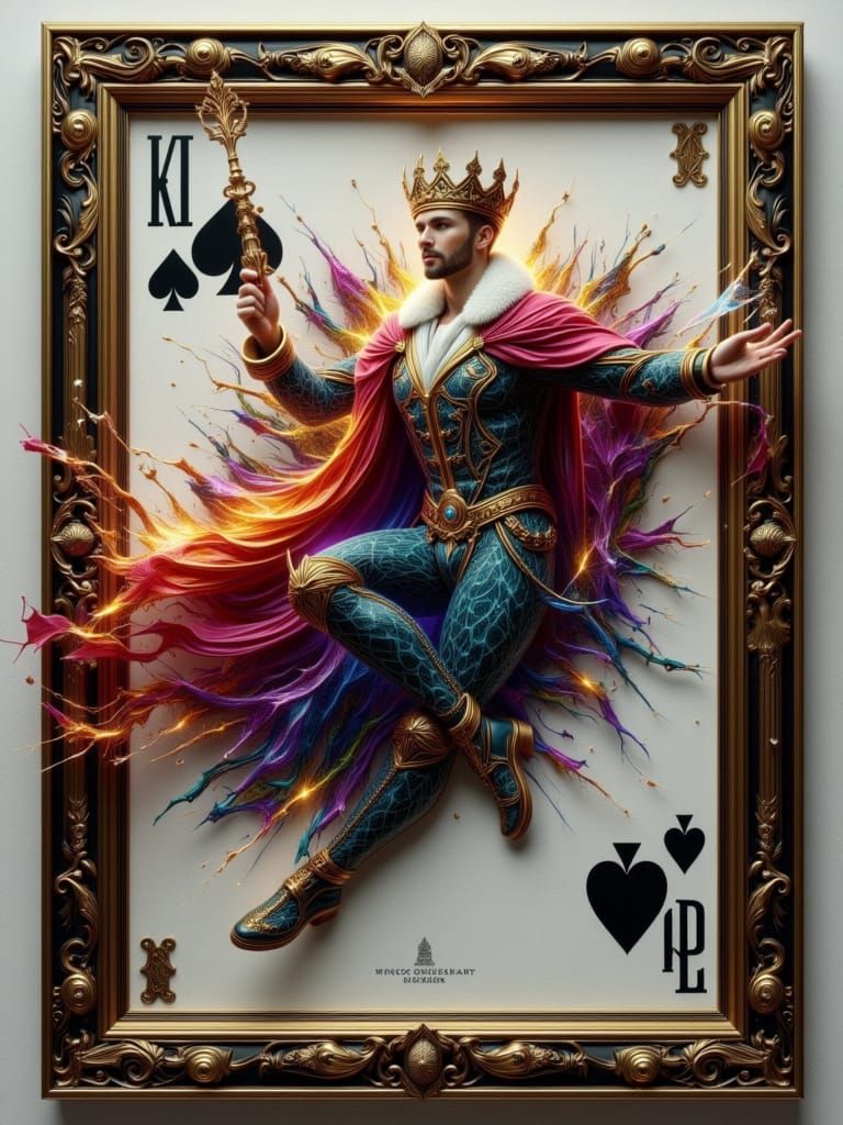 A striking picture of a steampunk king bursting through a playing card to seize his scepter. The portrait is rendered in watercolor with 3D holography and set in an ornate frame.
