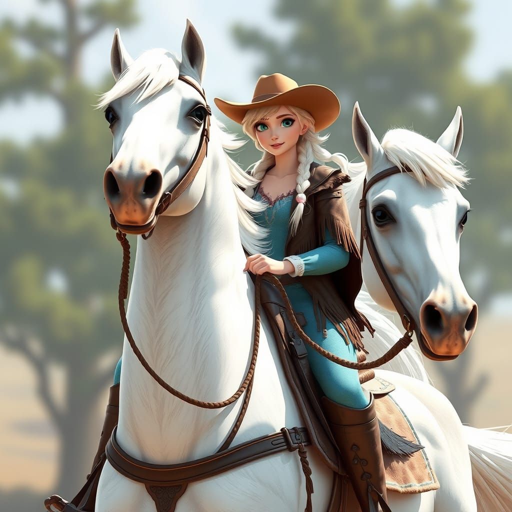 A whimsical image of Elsa from Disney's Frozen as a cowgirl riding a white horse. The art style blends fantasy elements with realistic western details, reminiscent of a Studio Ghibli animation.