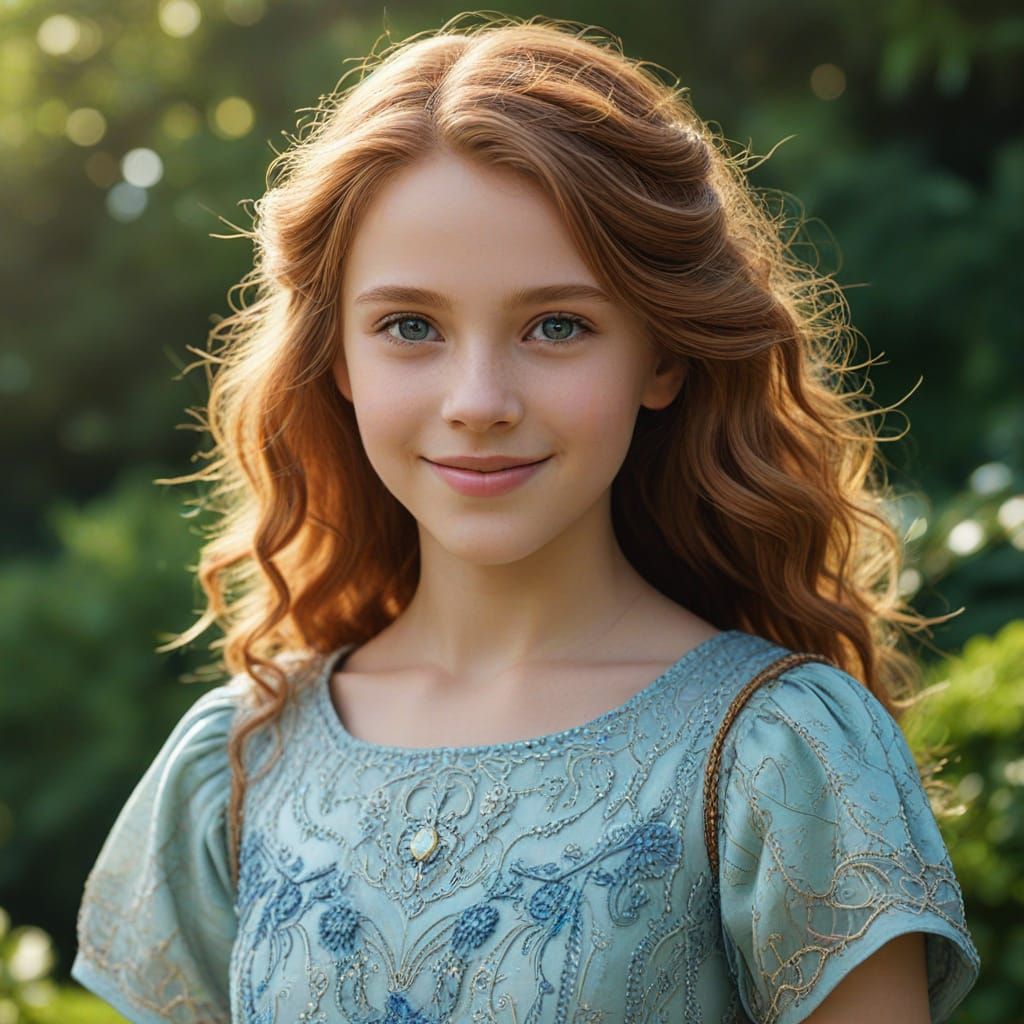 "A beautiful 10-year-old girl with light auburn, wavy hair and vivid blue-green eyes. She has soft Celtic features: a fair, slightly warm complexion, a gentle sprinkle of freckles across her nose, and full natural lips. Her eyes are deep and expressive, showing a thoughtful and confident look. She has a delicate, heart-shaped face with a smooth forehead, slightly arched eyebrows, and a small, elegant nose. She is smiling subtly, wearing a simple, pastel-colored dress, standing outdoors with soft natural lighting, surrounded by greenery.