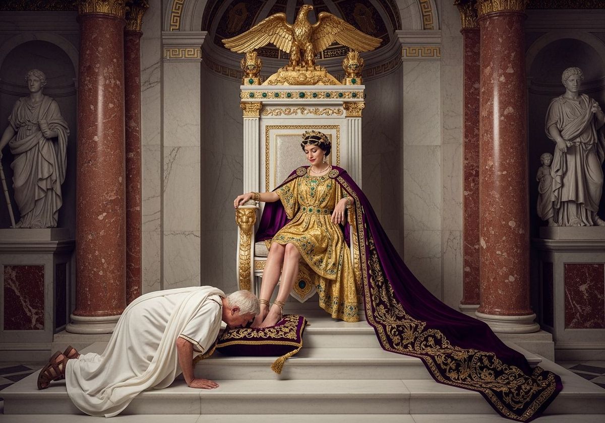 This image shows Empress Messalina on a grand throne, an old Roman senator kneeling before her in a display of power. The opulent scene is captured with ultra-sharp focus and wide-angle perspective.