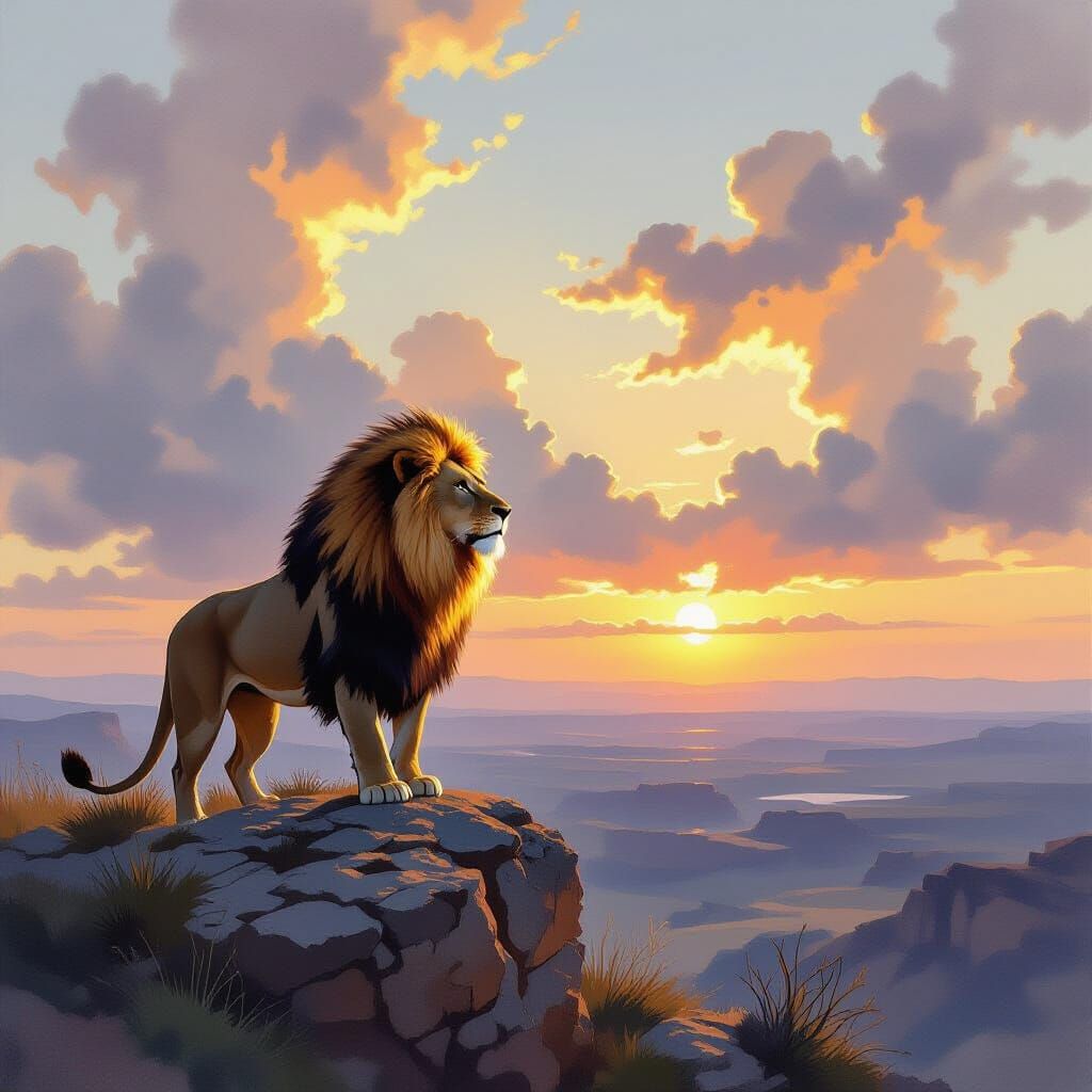 A powerful lion stands on a rocky outcrop at dawn, bathed in dramatic sunlight breaking through clouds. The image features expressive brushstrokes and cinematic lighting, evoking a moody atmosphere.