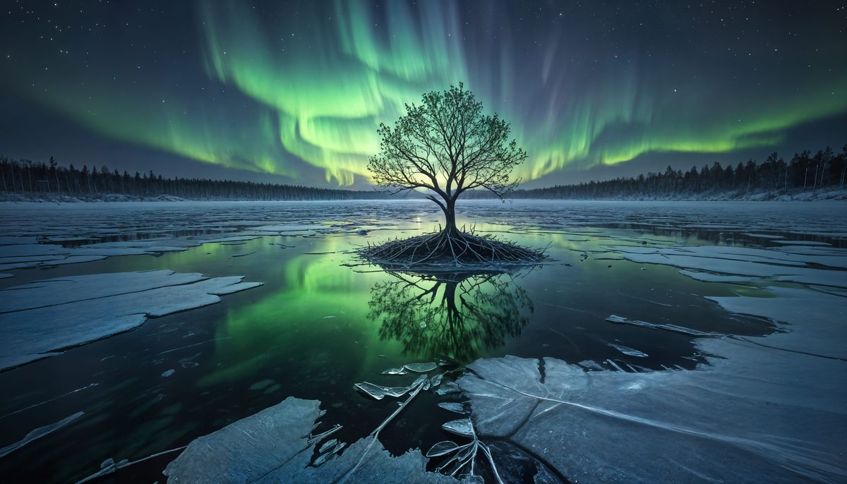 This image shows a frozen lake under a twilight sky where a vibrant green sapling grows from the ice. Aurora lights reflect on the surface, creating a surreal, dreamlike atmosphere.