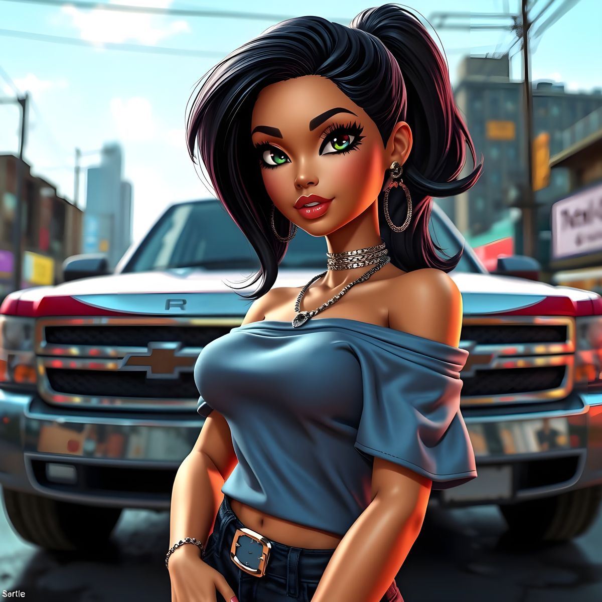 This image showcases a Cambodian girl with bold features and a playful pose, blending 3D bratzdoll and Barbie charm in a vibrant, pop art setting with a cityscape background.