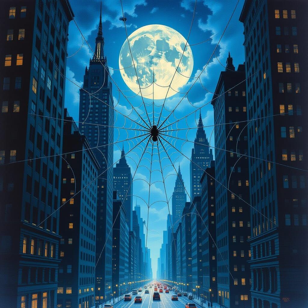 This image depicts a colossal spider web connecting skyscrapers, casting deep shadows over a city illuminated by eerie moonlight. Rendered in a detailed gouache painting style with visible brushstrokes and rich colors.
