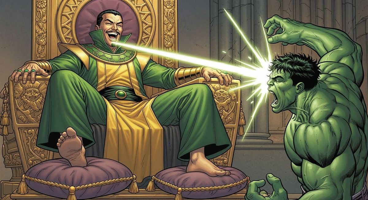 This image shows the Mandarin on his throne, unleashing energy on the Hulk. The scene is rendered with hyperrealism reminiscent of comic book art, with meticulous detail and vibrant colors.