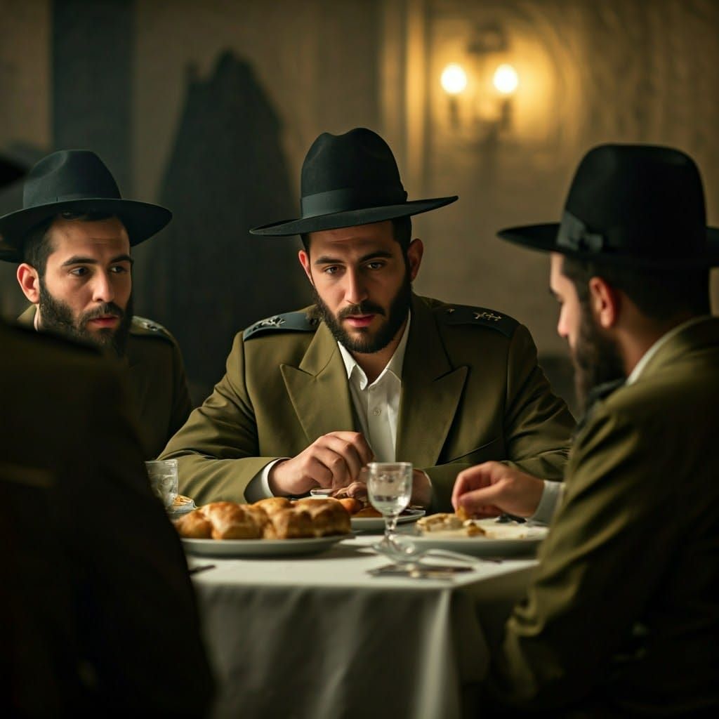 This serene image captures Israeli soldiers gathered around a beautifully set Shabbat table, surrounded by warmth and a deep sense of community. The soft, cinematic glow and rich color palette evoke a sense of reverence and faith, as they break bread and share stories in a peaceful atmosphere.