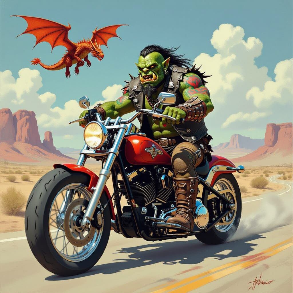 This image shows an orc biker speeding down a highway on a chopper. The scene is set in a post-apocalyptic wasteland and is reminiscent of heroic fantasy art.