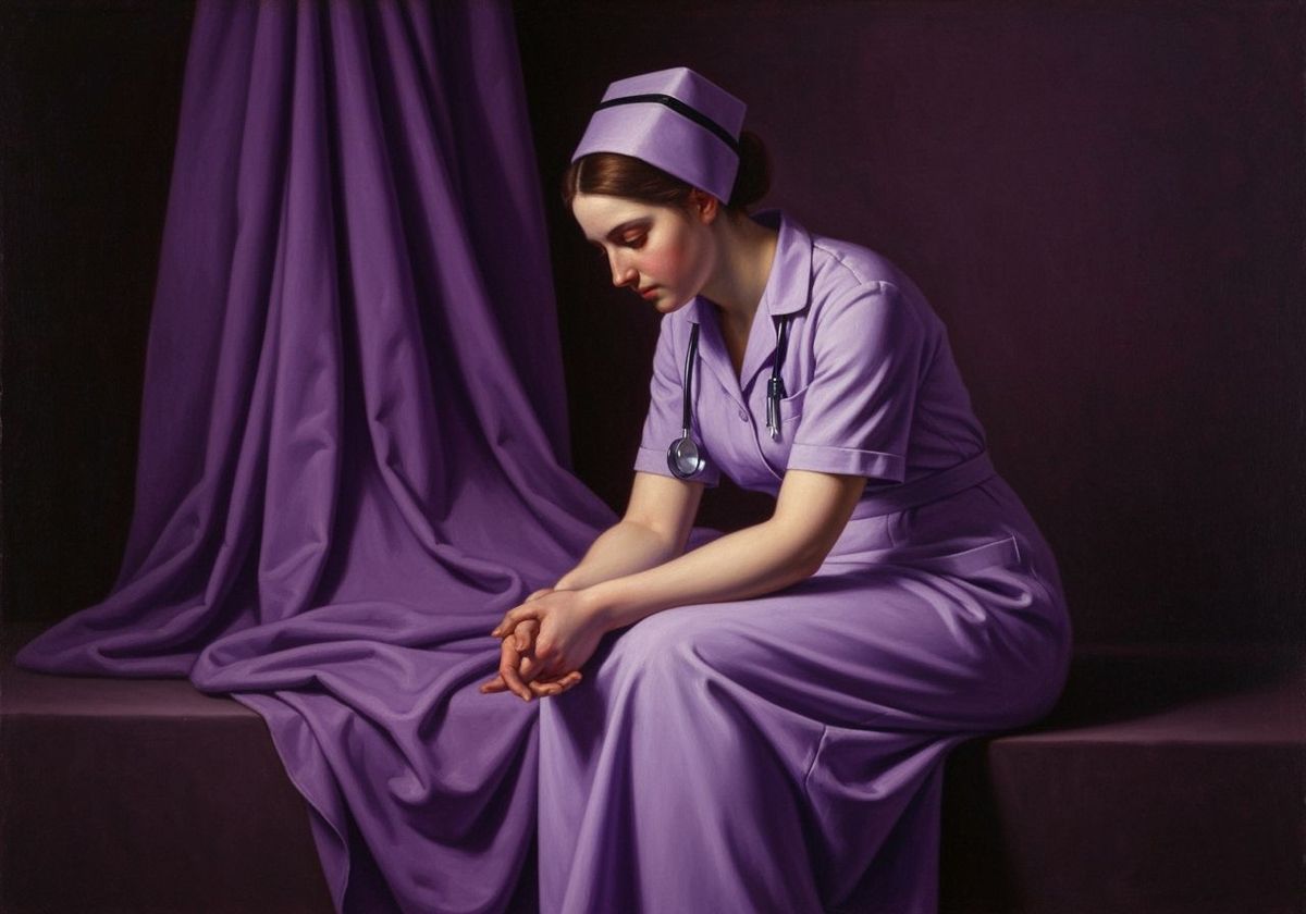 This image presents a modern nurse in a Baroque oil painting style. The scene is dominated by deep purple hues, with soft illumination against dark shadows, conveying stillness and gravity.