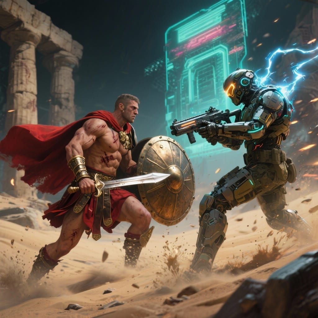 A powerful Roman gladiator fights a futuristic soldier with an energy blade. The scene blends ancient ruins with neon lights and advanced technology.