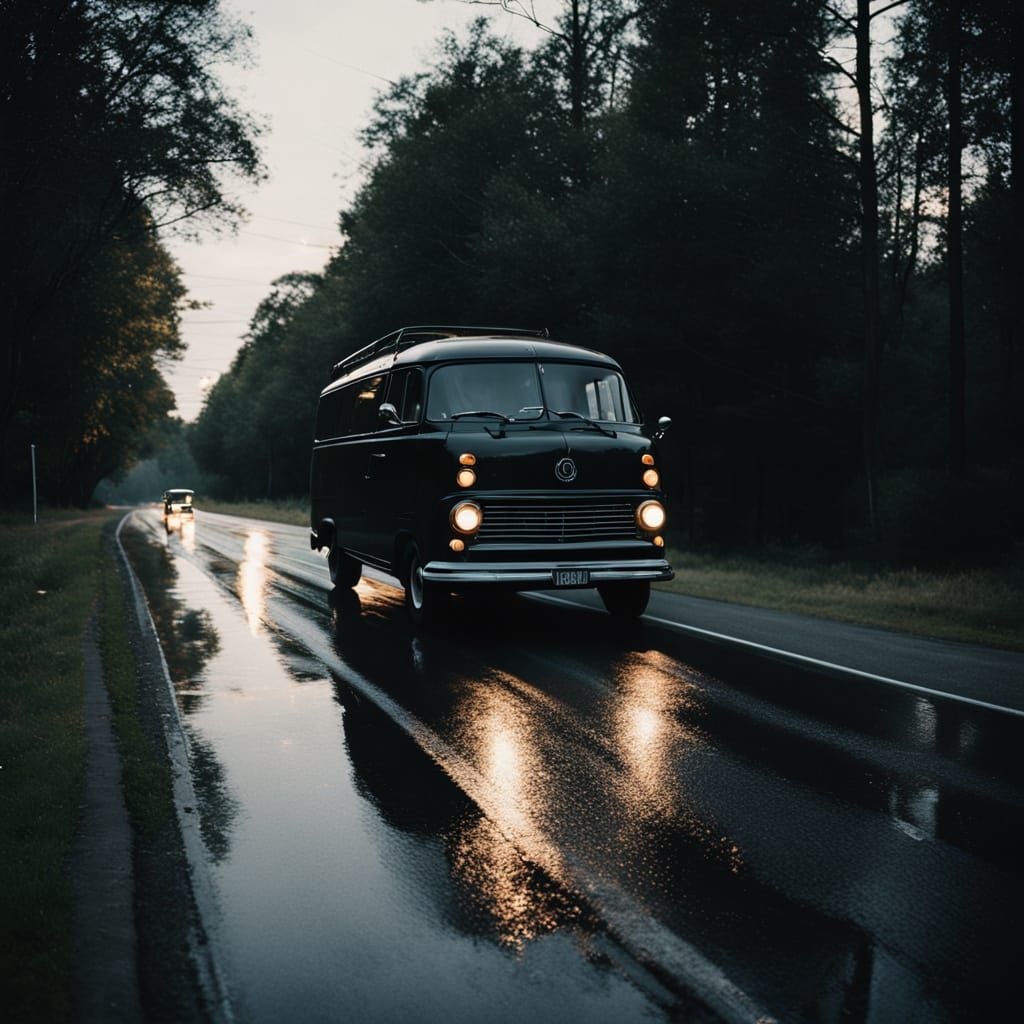 A dramatic film still featuring a black van on a wet road. Golden hour lighting and moody shadows create a film noir aesthetic with dark reflections. The image is reminiscent of classic cinema.