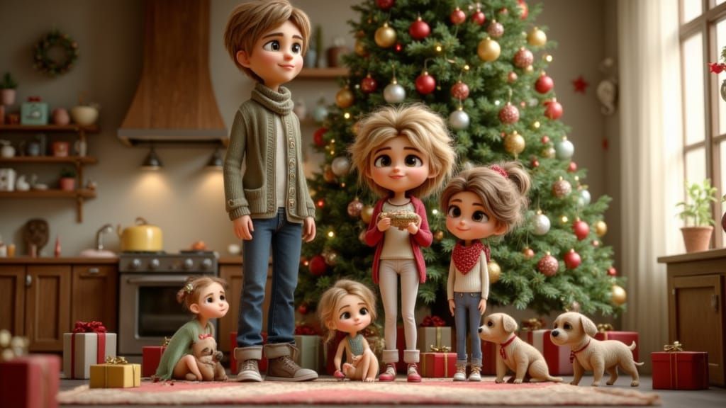 Generate unique 3D family scenes with pets and festive decorations easily. Free and simple AI image creation.