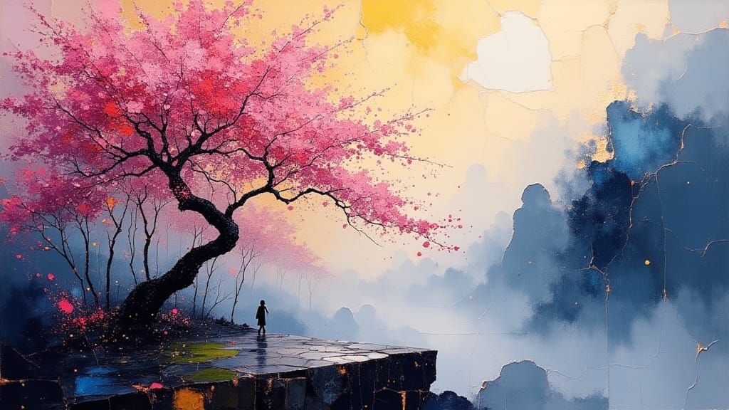 A misty cherry blossom landscape with pink blossoms and trees. This image features thick impasto oil brushstrokes, diffused ambient light, and an ethereal glow, rendered with vibrant complementary colors.