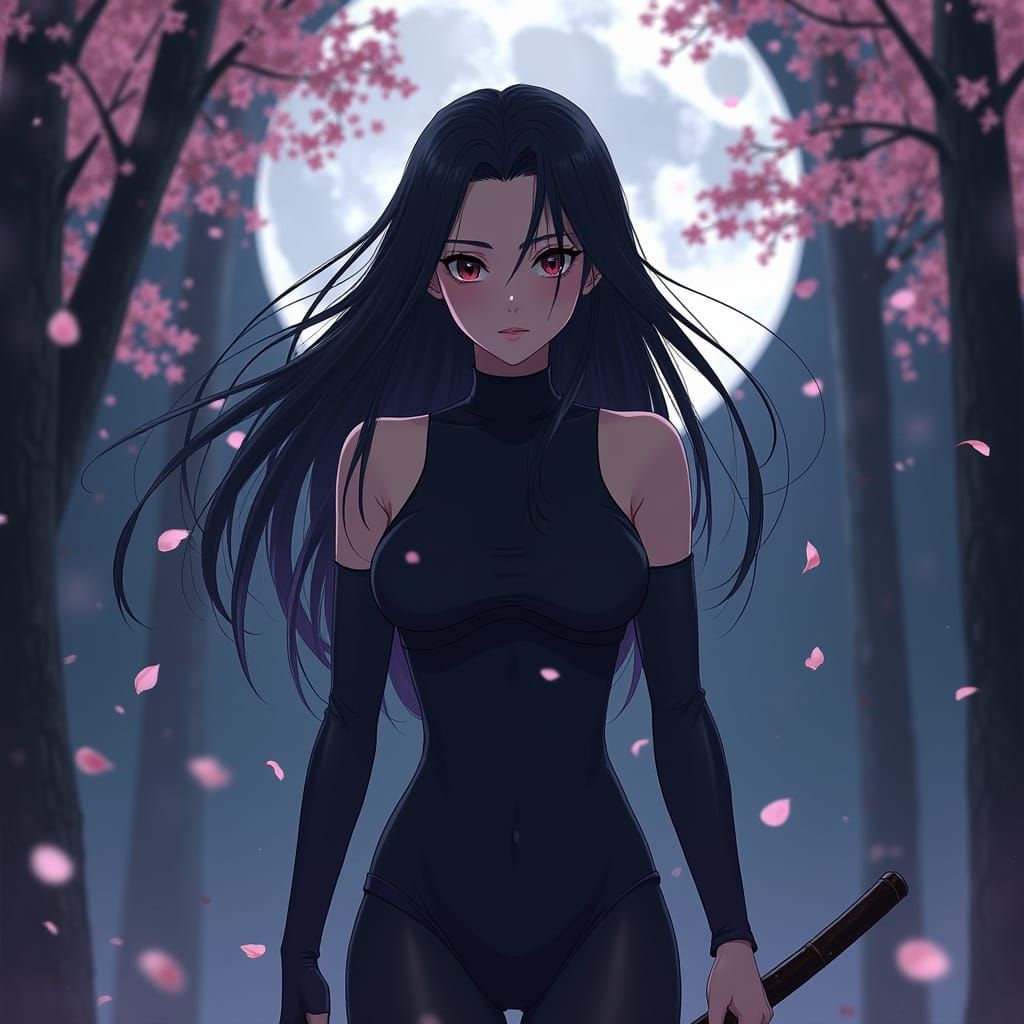 This image shows a stunning female ninja standing in a serene, moonlit Japanese forest surrounded by delicate cherry blossom petals and soft light, with ultra-detailed anime-realistic visuals in a futuristic, cyberpunk-inspired aesthetic