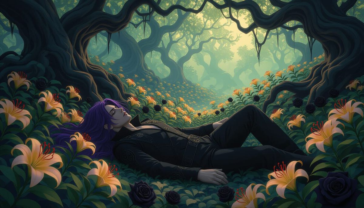 A gothic image of a dark-haired man reclining in a surreal garden. The scene is bathed in dynamic lighting with hyperdetailed textures, reminiscent of art nouveau with vibrant colors.