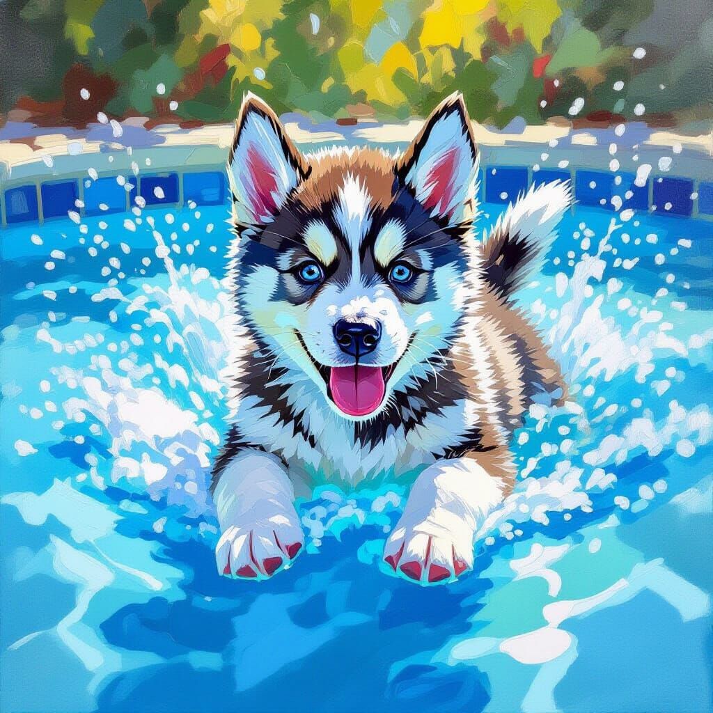 This image captures a joyful husky puppy swimming in a bright blue pool, rendered in an expressive impasto oil painting style with textured brushstrokes and vibrant colors. It evokes a feeling of summer fun.