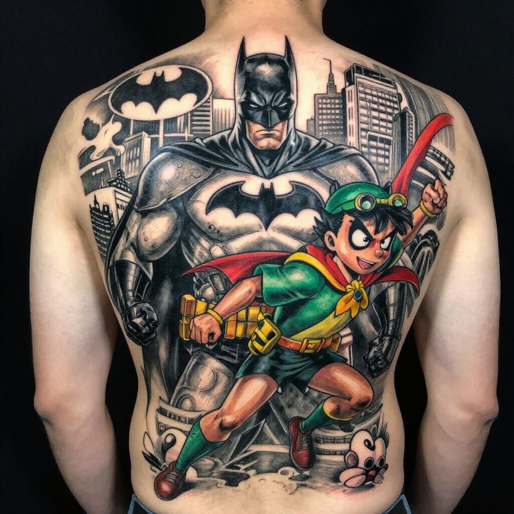 This hyperdetailed charcoal drawing showcases a vibrant, intricate tattoo of Batman and Robin in dynamic comic-book style poses on a man's back. Features realistic shading and a cityscape background.