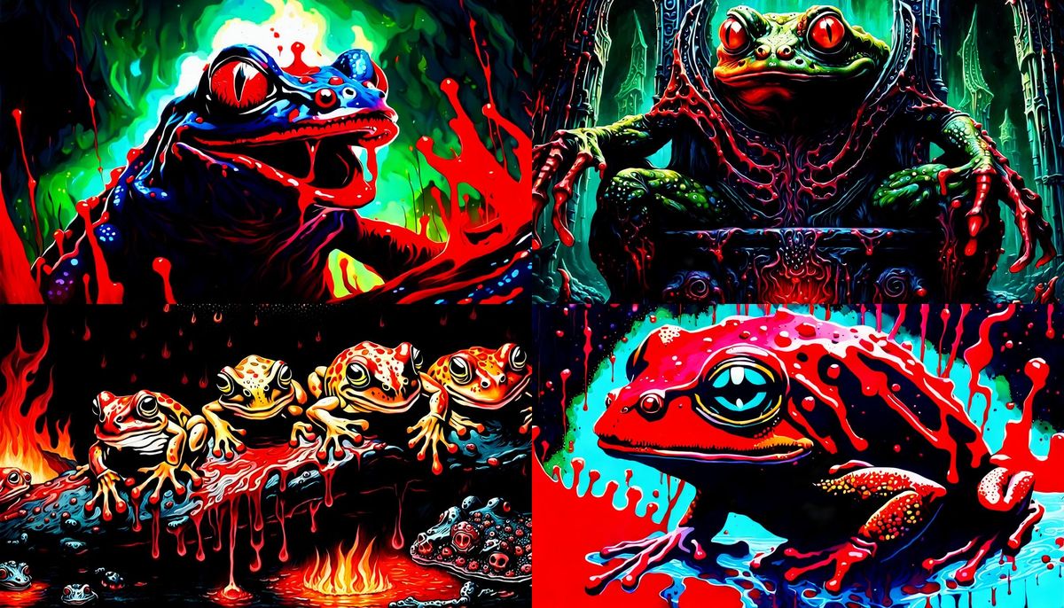 This image shows demon frogs of the anti-Christ writhing in a flood of blood in hell. The artwork is acrylic on canvas and uses horror art elements with great colors.