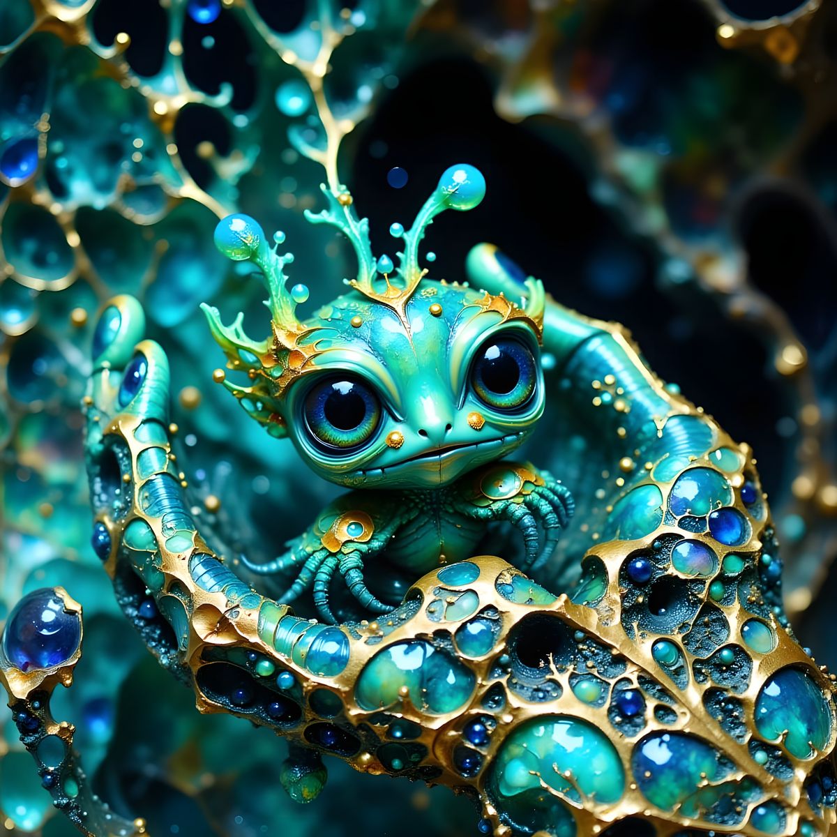 A micro shot of an alien hand holding a transparent green creature. This digital artwork features chrome textures, glowing colors, and intricate details, creating a surreal and captivating image.