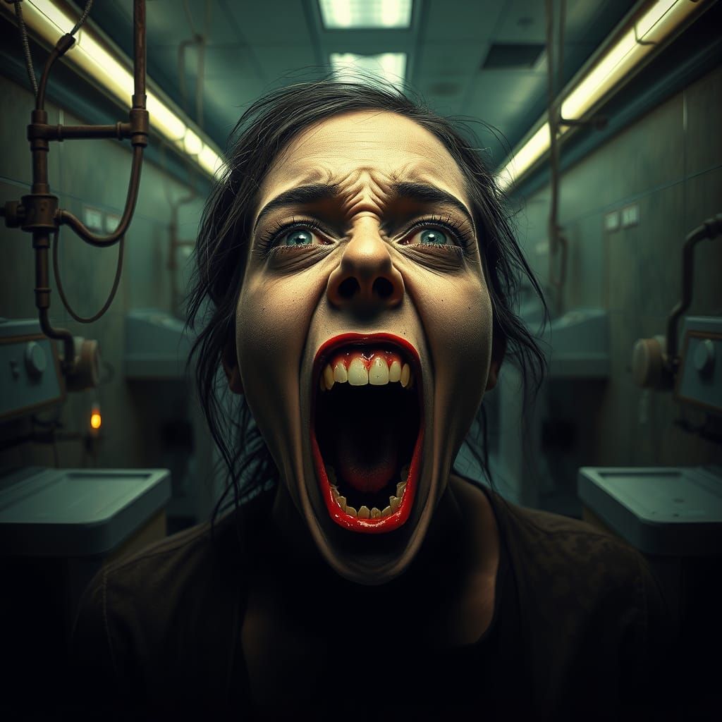 This haunting image captures a woman's terror as she screams in a decrepit asylum, surrounded by eerie shadows, cobwebs, and flickering lights, reminiscent of biomechanical nightmares and surreal, post-apocalyptic landscapes.