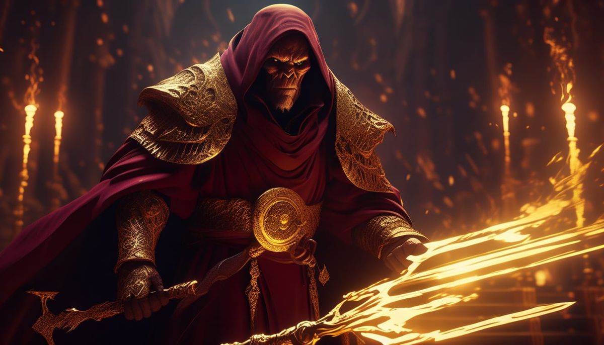 A striking picture of a figure in maroon and gold robes holding a staff and gazing into a dark abyss. The digital artwork features cinematic lighting, warm colors, and intricate details.