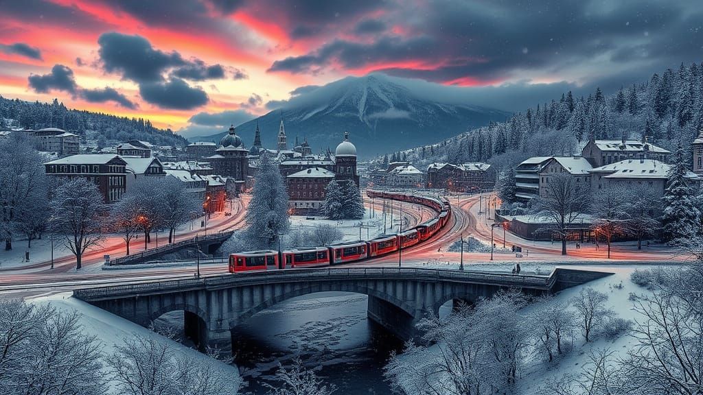 This stunning fotorrealista painting depicts a dense, neglected city shrouded in mist, with vibrant tranvías crossing a bridge. The scene is set against a backdrop of intricate clouds, majestic mountains, and a warm, dark red atardecer. The artwork is characterized by its hyper-realistic details, rich co...