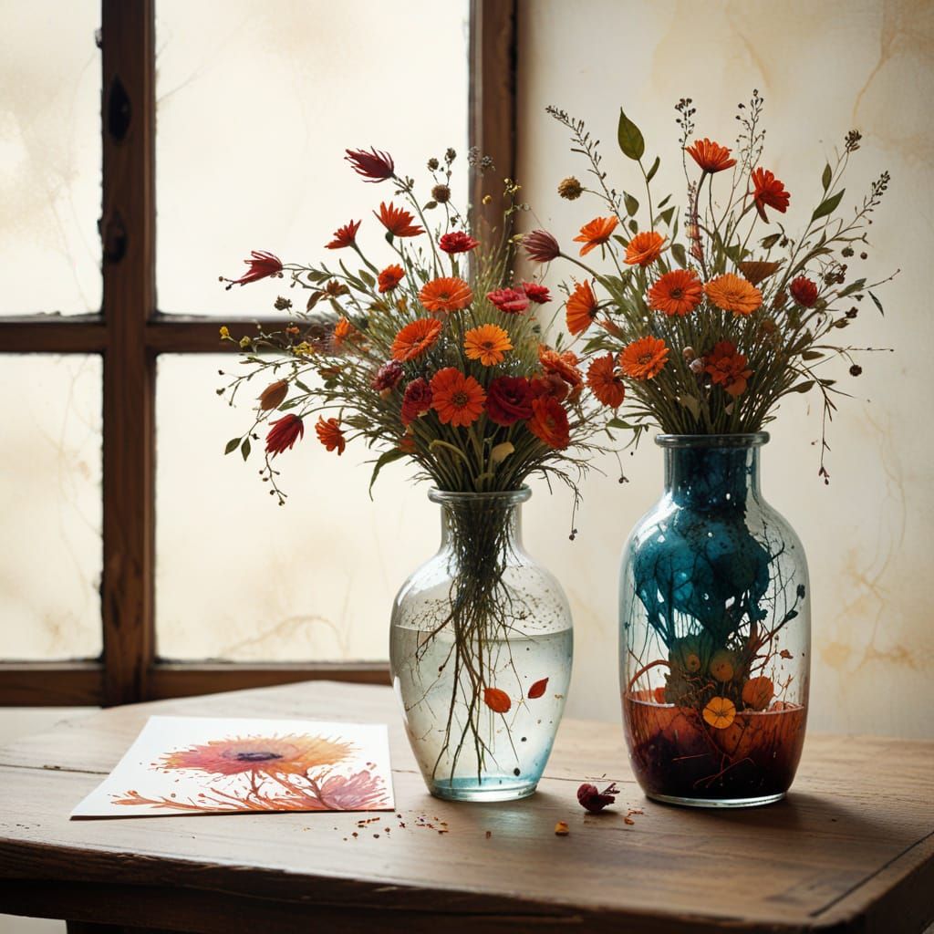This image is a vibrant, watercolor-style depiction of a bouquet of flowers in a vase, with a focus on red and tangerine hues. The delicate, whimsical style is reminiscent of traditional fine art techniques.