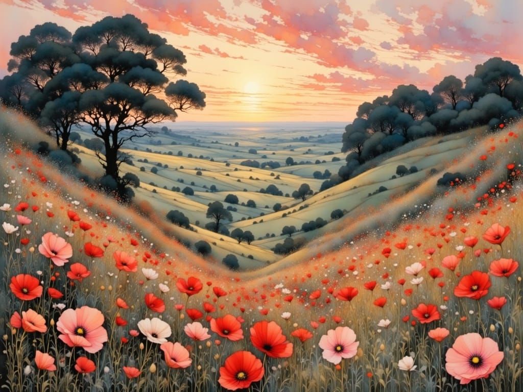 This image showcases a serene landscape of vibrant red poppies swaying in a soft pink evening glow, blending traditional and modern techniques to evoke a sense of wonder and ethereal beauty.