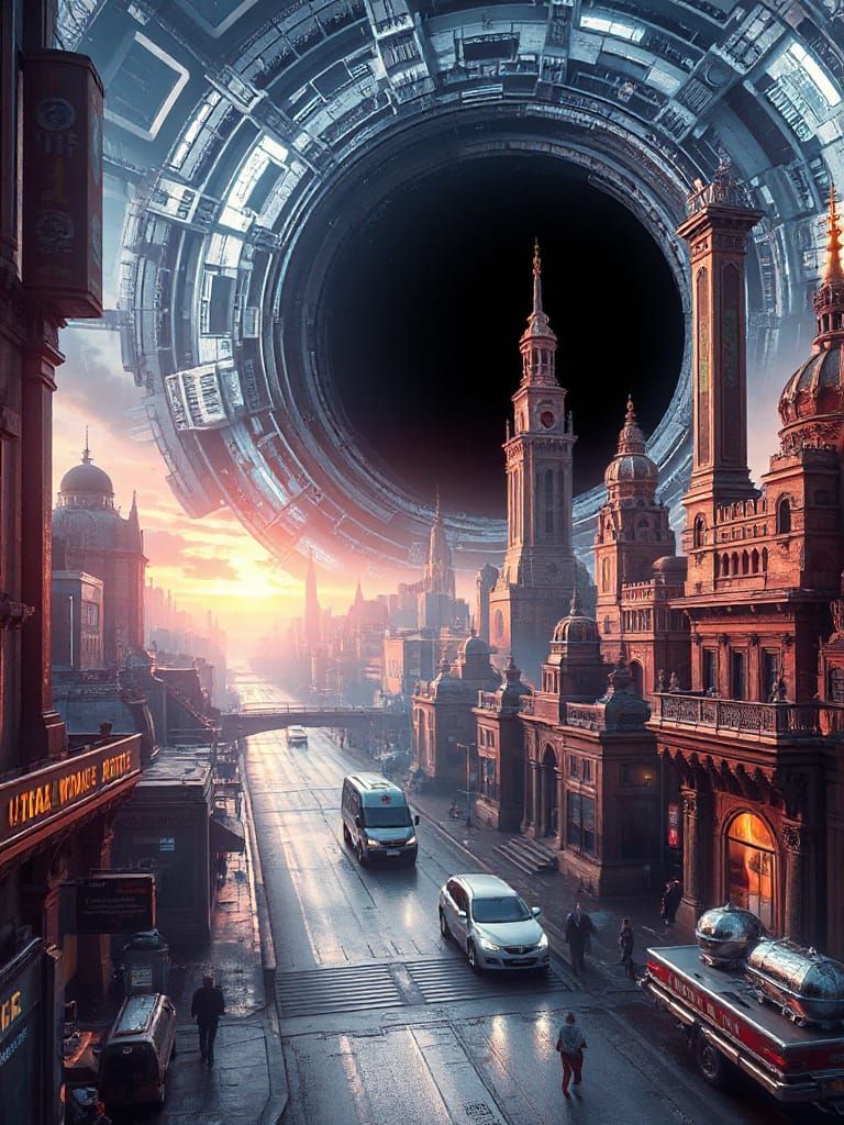 Photorealistic. High resolution, high quality, vibrant, highly detailed. A grand futuristic city, the details of its architecture are visible. The city is dragged into a black hole, the essence of reality and the substance of space warps as it is pulled into the singularly. A masterpiece that blends ...