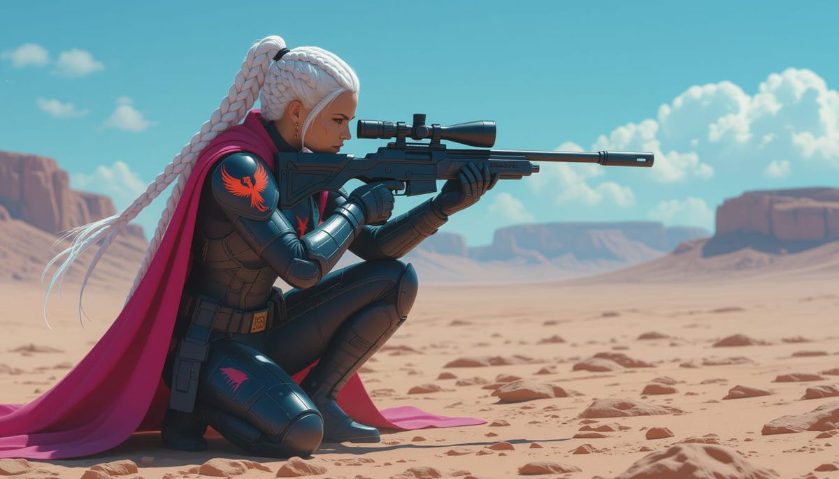 A futuristic warrior with braided white hair is crouched on an alien landscape, clad in dark blue armor. This image, with cinematic film grain, evokes a neon-lit and dystopian aesthetic.