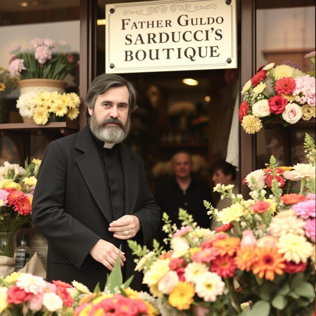 Father Guido Sarducci selling flowers in his flower shop. A sign in the background advertises this is Father Guido Sarducci's Boutiqu...