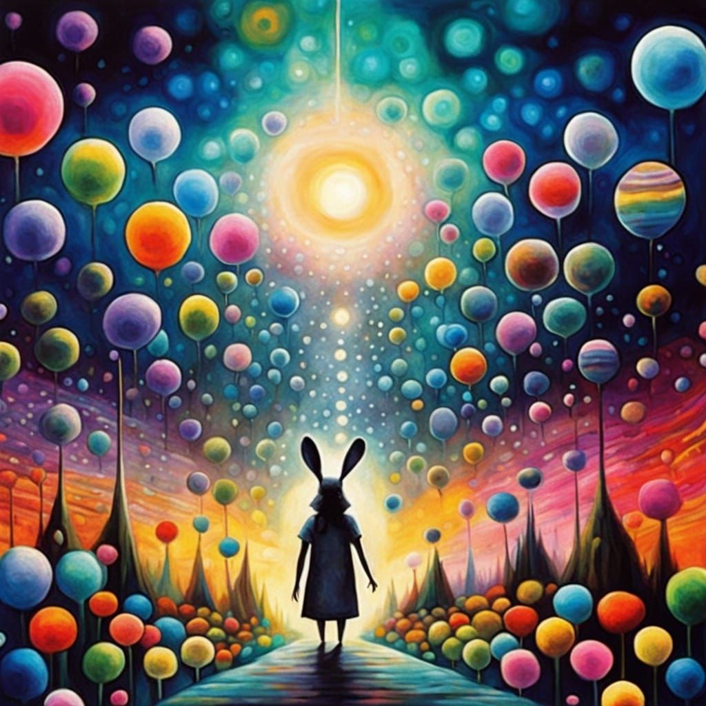 This vibrant, dreamlike image depicts a spirit woman in a stunning Native American patchwork costume, surrounded by flowers, feathers, and trees, with a ghostly hand reaching up to a white rabbit in a breathtaking, fantastical dreamscape.
