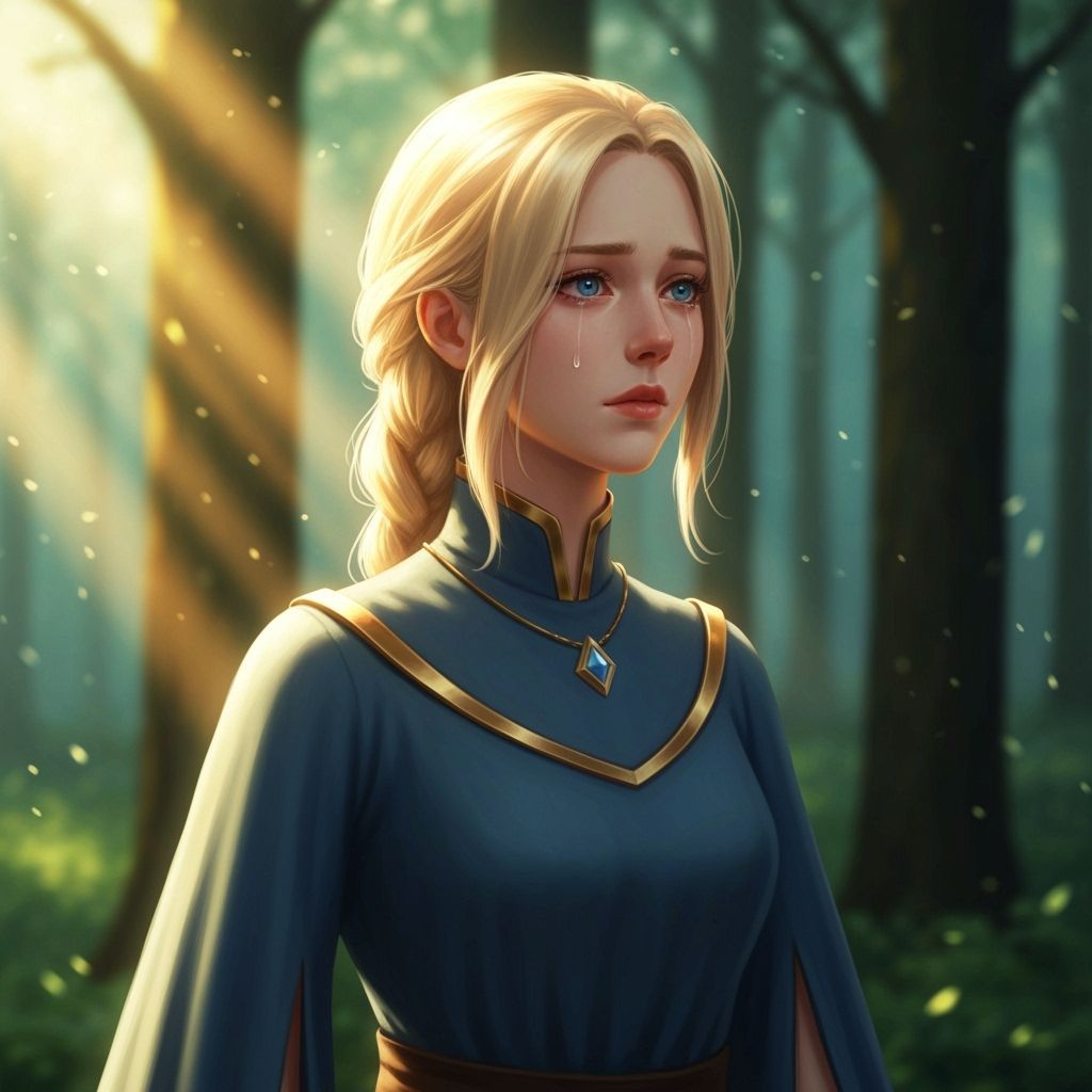 A digital anime illustration of a woman in a military-style coat standing in the rain. The image captures a reflective and emotional moment with cinematic lighting and painterly shading.