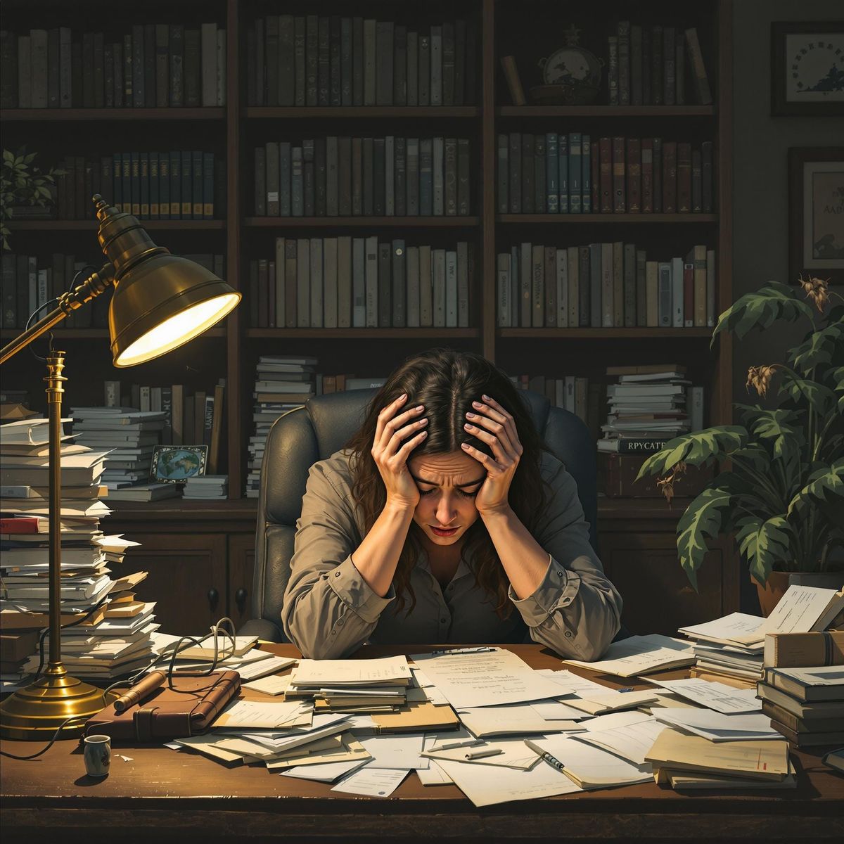 This image shows a tired psychologist at her desk, surrounded by paperwork. The soft lighting and muted colors create a warm atmosphere, while the details of the scene highlight her exhaustion.