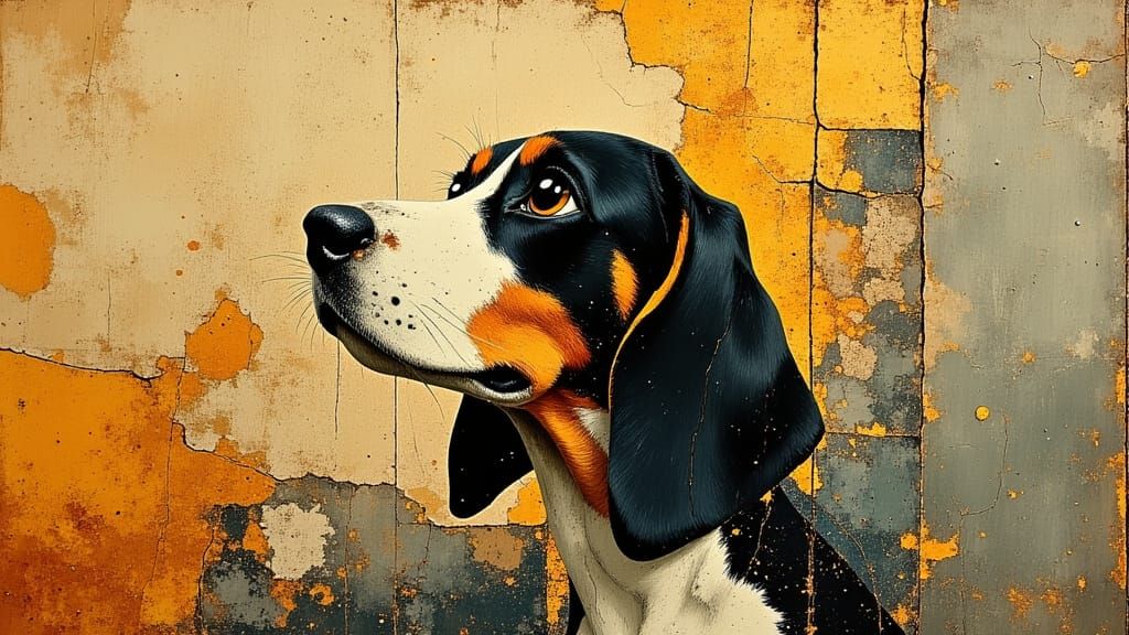This image showcases a basset hound captured in a divine oil painting style, resembling Midjourney's aesthetic. It features intricate detail and high resolution with cinematic volumetric lighting.