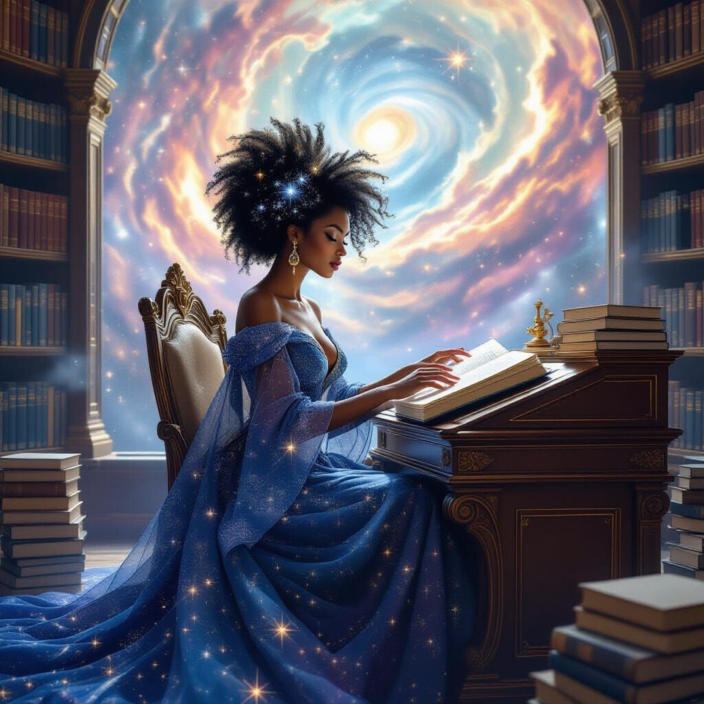This image shows a Black woman as a celestial librarian in a floating library. She is surrounded by galaxies, wearing a gown of constellations, in a dreamy, cosmic illustration aesthetic.
